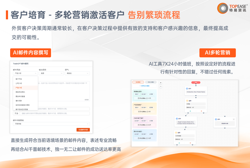利用AI多轮营销,动态调整发送时间AI多轮营销功能在邮件发送时间优化上还有动态调整的优势。在多轮邮件营销过程中,易搜邮可根据客户对前一轮邮件的反馈,实时调整下一轮邮件的发送时间。比如,某外贸企业向一批东南亚客户发送推广邮件,第一轮邮件在当地时间上午发送,打开率较低。通过AI多轮营销功能分析发现,这些客户在下午处理工作邮件的比例更高。于是,在第二轮邮件发送时,利用易搜邮将发送时间调整到当地时间下午,结果打开率明显提升。通过不断根据客户反馈动态调整发送时间,逐步优化邮件营销效果。